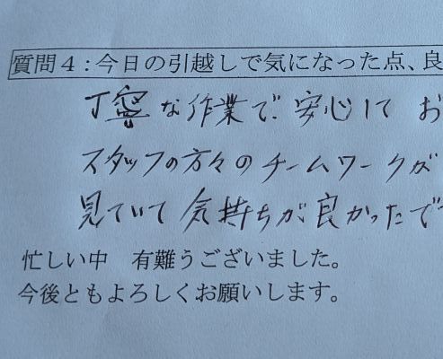 にこやかで楽しく作業していただいて気持ちよく引越しできました。 ありがとうございました。