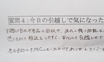 搬出から搬入まで、とても丁寧に作業して下さりました。引越し費用もとてもお安くしていただきました。