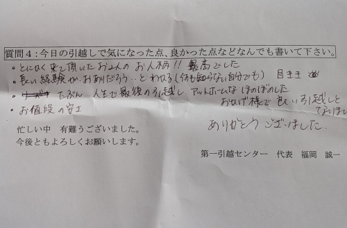 今度引越しするときがあれば、また第一引越しセンターさんに頼みたいと思います。