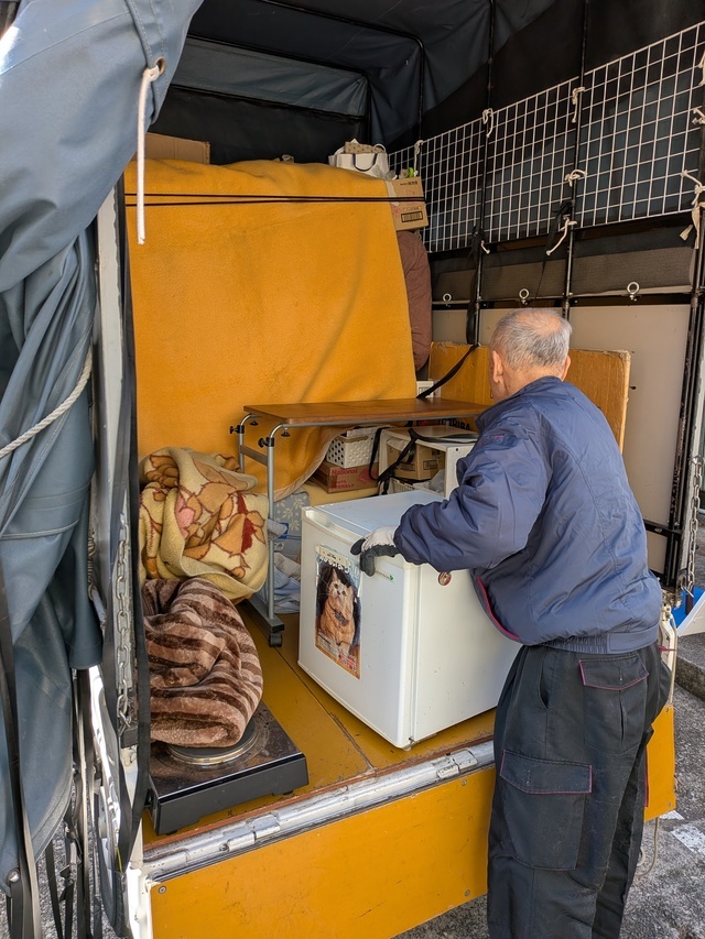 軽トラ1台に収まりました。引越し先は二階で、らせん状になった外階段から冷蔵庫を上げました。