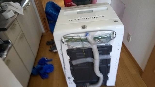 洗濯機に毛布を掛けて梱包材(業界用語でジャバラ)で包んでいます。