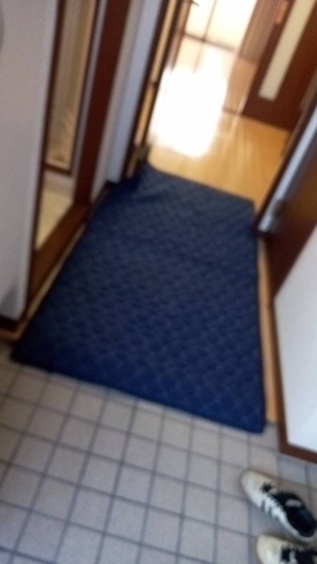 玄関入り口に傷防止の玄関マットを敷きます。洗濯機の設置も無料です。 給水、排水テストOKぴったりと収まりました。