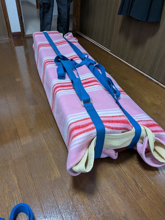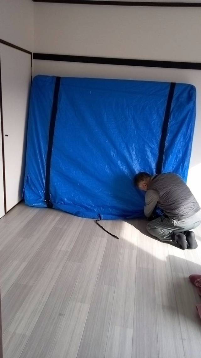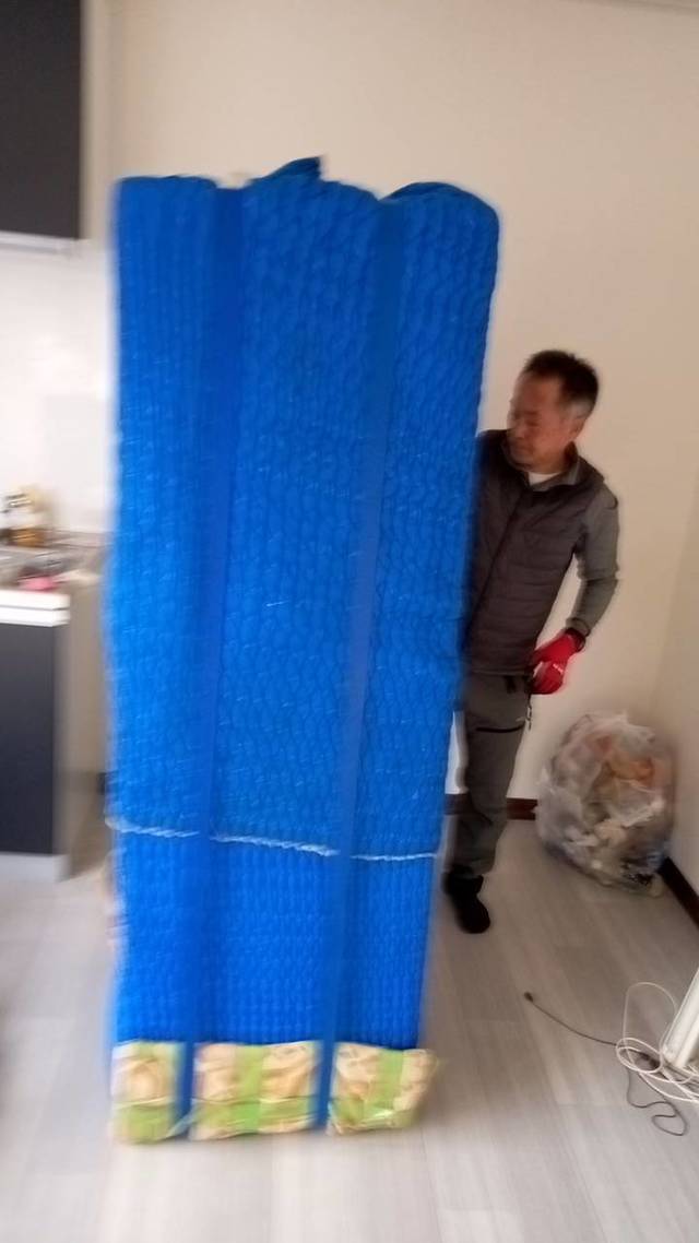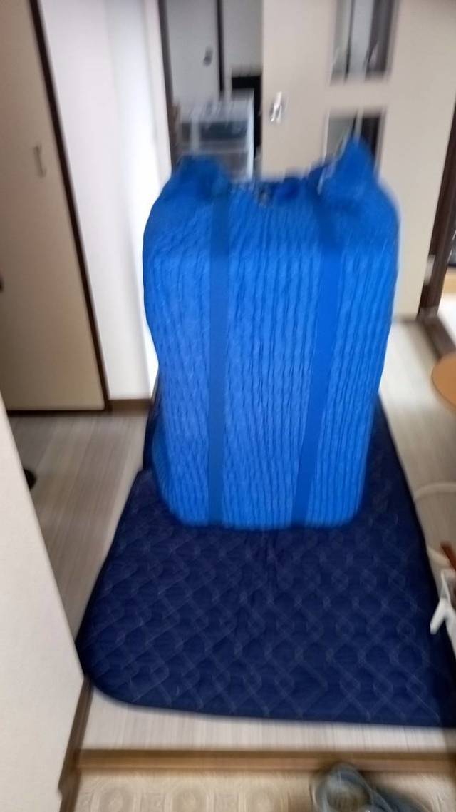 高知市内からいの町への引越しです。 養生用の保護材、引越し業界では「ジャバラ」と言います。その蛇腹を忘れて今回は毛布2枚で代用させてもらいました。 お客様の大切な荷物ですのでキズが付かないように気を使い設置しています。。