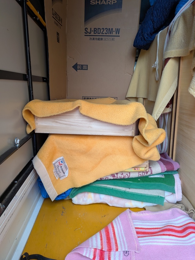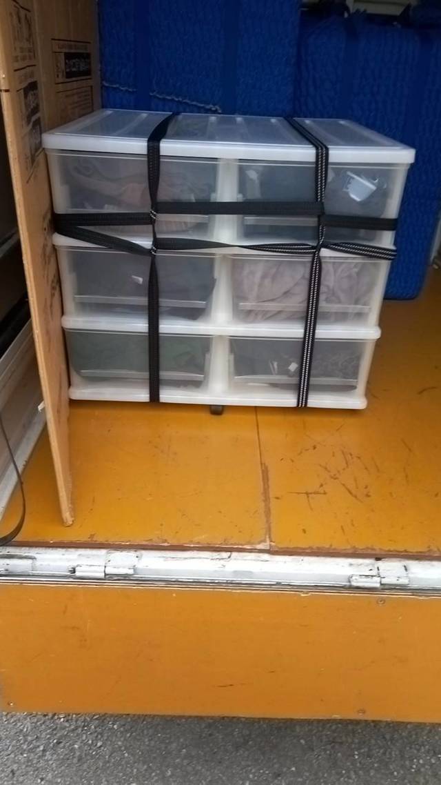 高知市内間の引越しです。 冷蔵庫、洗濯機の養生をしています。 3段の衣装ケースはバラけないようにラッシングベルトでしっかり止めています。 45型の液晶テレビ、クイーンサイズのマットレスも養生しています。
