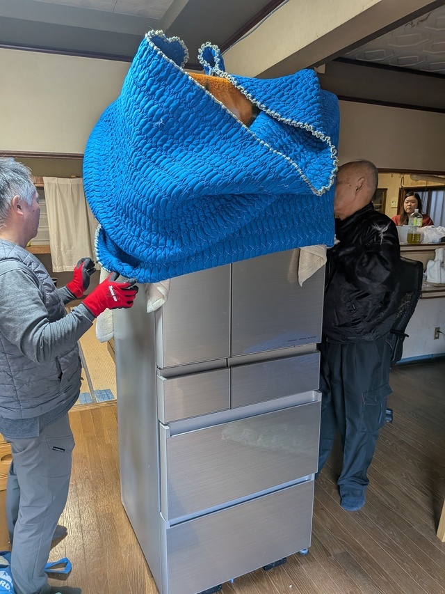 冷蔵庫はしっかり養生をして4人で運んでいます。