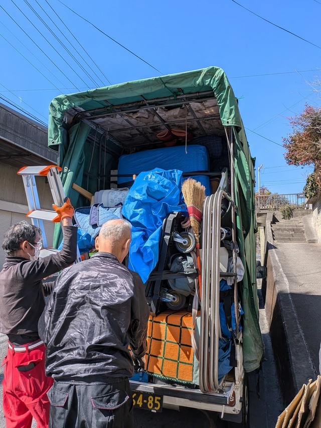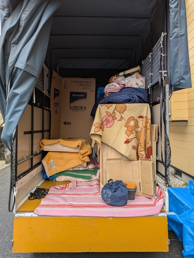 ベッドや布団、タンス、冷蔵庫、洗濯機等で大きなものがあり、軽トラック1台半の積載量でした。(写真は積み込み途中です)